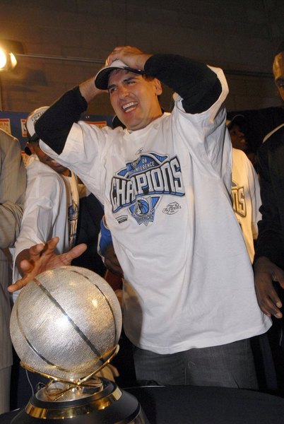 小牛頭號球迷-老闆Mark Cuban於2006年穿著西區冠軍T桖的高興神情