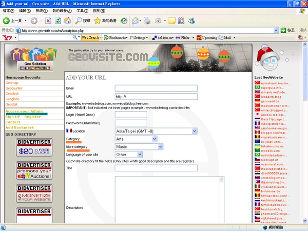 Email, URL(你blog或網站的網址), Login(帳號名稱), password(密碼),Location(時區,臺灣是Asia/Taipei)Category是讓你挑選屬於你blog的分類,挑選完後More Category會跑出子分類的選單(下圖中用arts-music為例),Language of your site輸入你blog使用的語言(找不到"中文"挑other),剩下Title與Description填一下你blog的標題與相關描述(會顯示在Geovisite.com)。最後"磁片圖示"作save的動作
