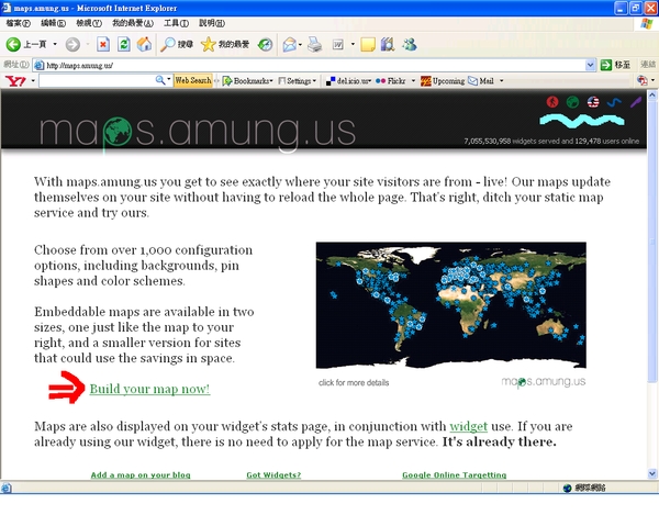 1.首先來到map.amung.us的首頁 http://maps.amung.us/ ,按左方的"Build your map now!"直接進入 (右上方有其他服務,顯示線上人數的whos.amung.us,預測2008美國總統大選的Candidates.amung.us,和相關統計圖表的graphs.amung.us)