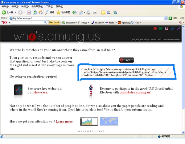 4.如果想加入顯示目前線上人數的widget,直接來到http://whos.amung.us/ ,將右方的code複製貼上到我們blog的自定欄位