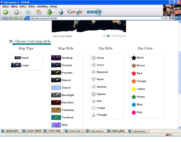 2.第一次使用此服務的人將第一點停在預設的no即可。直接把網頁往下拉到第二點(如圖)進入調整你要放大地圖/小地圖,地圖樣式,訪客的標記樣式與顏色。(上方的預覽圖會隨你的調整而改變)